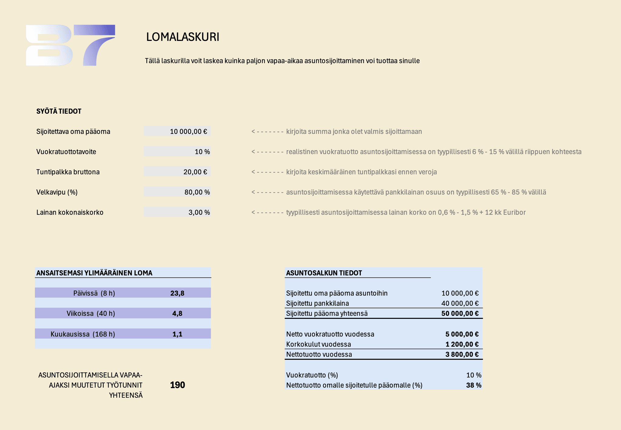 Aika on rahaa. Lomalaskurilla voit arvioida kuinka paljon asuntosijoittamisella juuri sinä voit "hankkia" itsellesi lisää vapaa-aikaa menettämättä tulojasi.