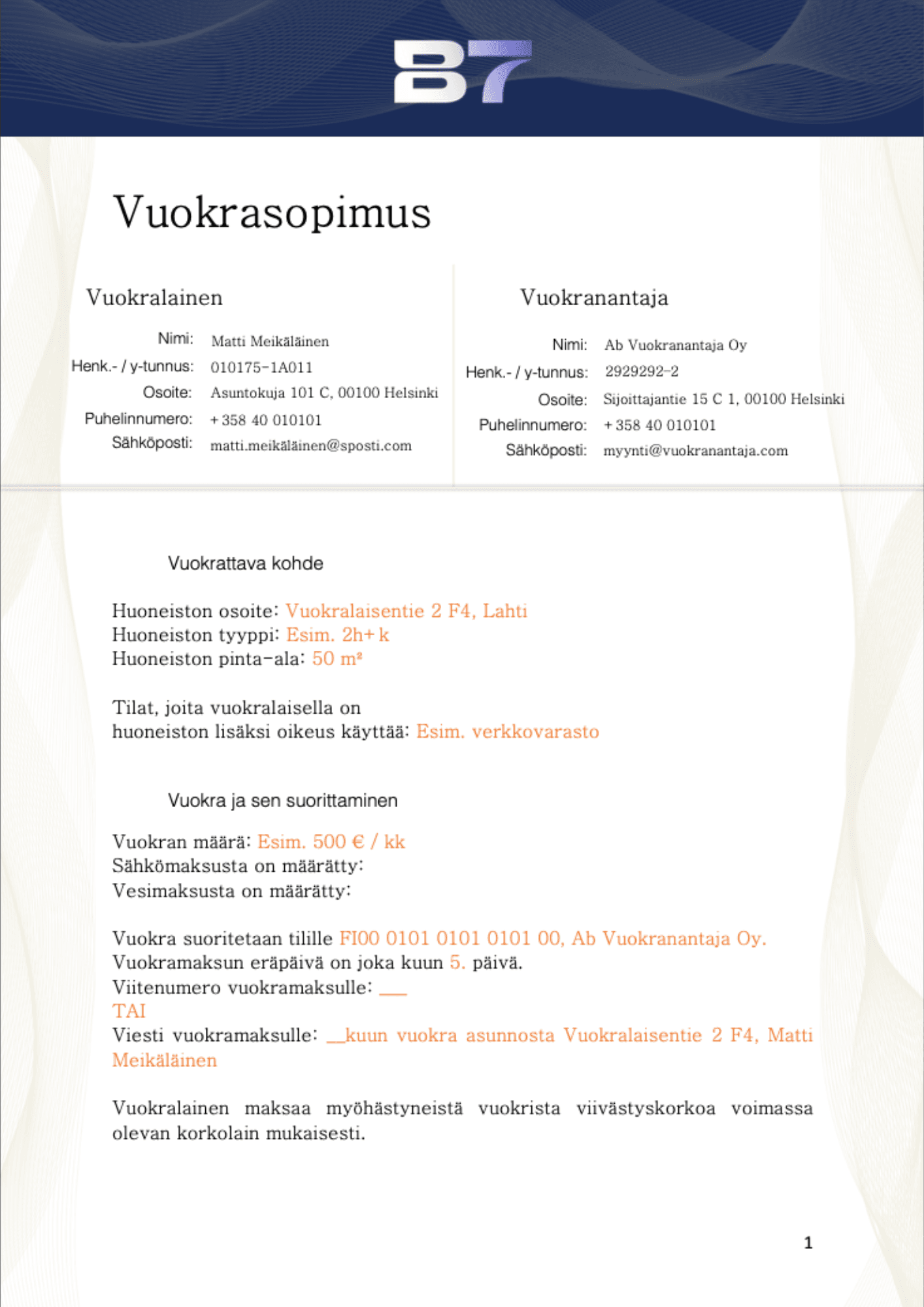 Muokattava vuokrasopimuspohja tarjoaa selkeän ja helppokäyttöisen ratkaisun vuokrasopimuksen laatimiseen. Sopimuksen muokkaaminen omiin tarpeisiin on helppoa, ja voit lisätä siihen juuri ne ehdot, jotka ovat sinulle tärkeitä.